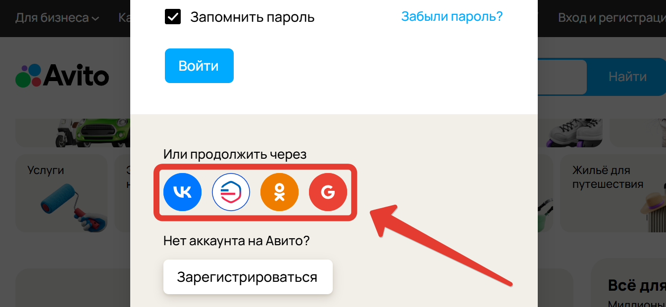 Войти на Авито вы можете через свой аккаунт в социальной сети (ВКонтакте, Одноклассники, Госуслуги, Гугл),нажав на соответствующий значок внизу панели входа и авторизоваться с помощью своей учетной записи в одном из сервисов.