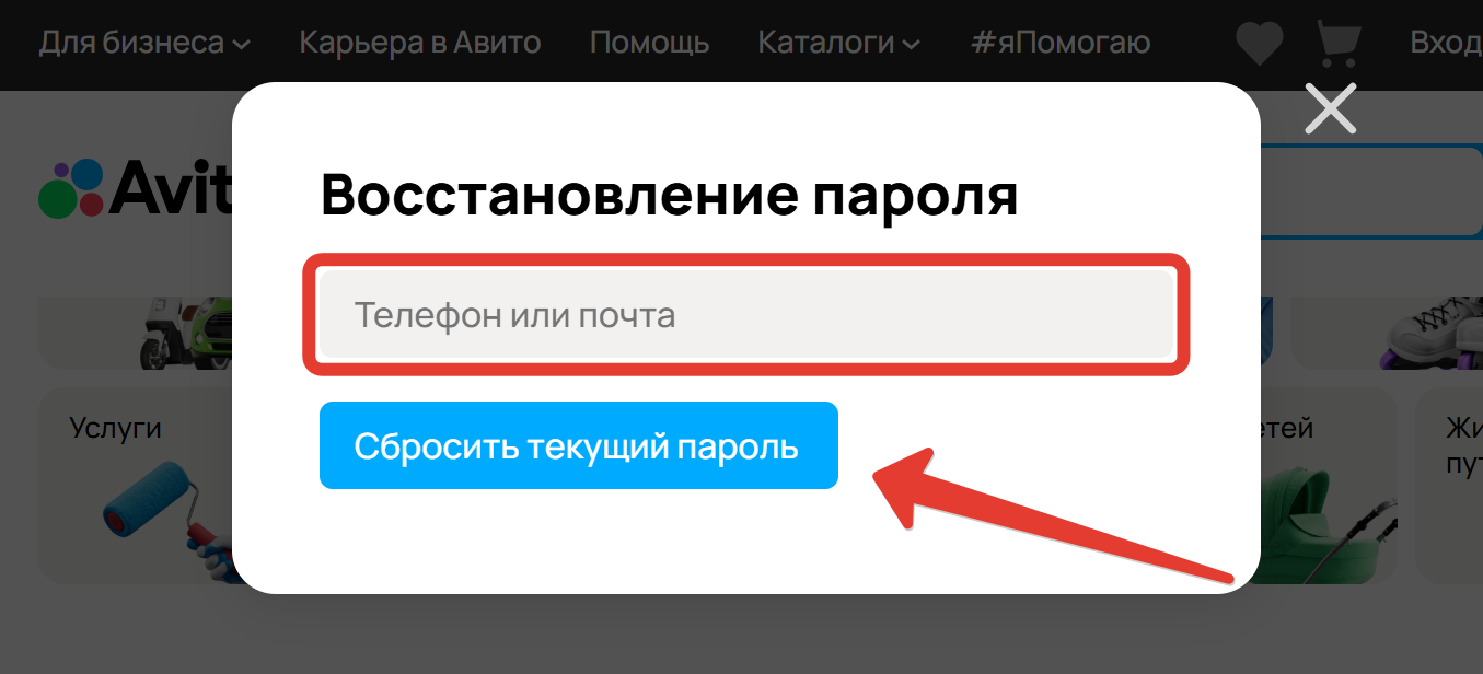 - На странице входа в личный кабинет Авито есть ссылка «Забыли пароль?». Перейдите по ней на страницу восстановления пароля https://www.avito.ru/#restore.