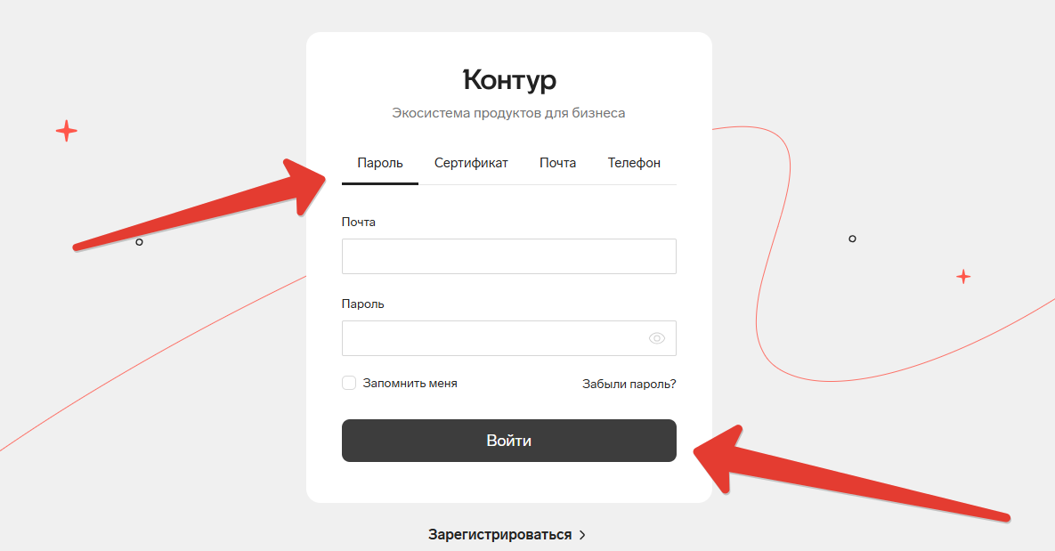 Нажмите на соответствующую вкладку на стартовой странице регистрации или перейдите на страницу https://auth.kontur.ru/.