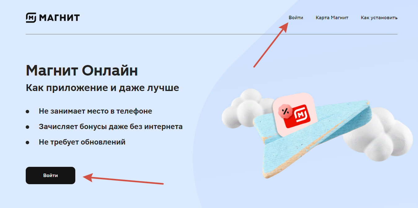 - На открывшейся странице https://my.magnit.ru/ кликните на ссылку «Войти»;