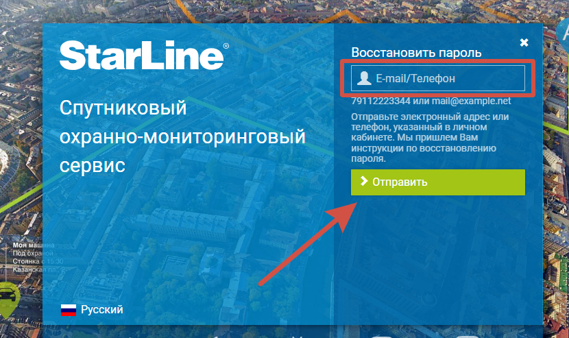 - На странице https://starline.online/#password-restore введите e-mail или телефон.